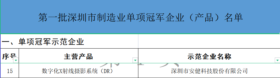 2023年1月6日,深圳市工業(yè)和信息化局公布《第一批深圳市制造業(yè)單項冠軍企業(yè)(產(chǎn)品)名單》,安健科技憑借在數(shù)字化X射線攝影系統(tǒng)(DR)領(lǐng)域的技術(shù)創(chuàng)新與領(lǐng)先的市場占有,獲評深圳市單項冠軍示范企業(yè)。