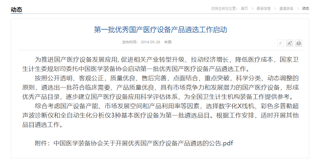 2014年,在習近平總書記上海視察并指出要加快高端醫療設備國產化進程后,國家衛生健康委立即啟動了優秀國產醫療設備遴選工作。2014年5月26日晚,衛健委發布公告稱,為推進國產醫療設備發展應用,促進相關產業轉型升級、拉動經濟增長,降低醫療成本,衛計委規劃司委托中國醫學裝備協會啟動第一批優秀國產醫療設備產品遴選工作。第一批設備為數字化X光機、彩超、全自動生化分析儀三種。